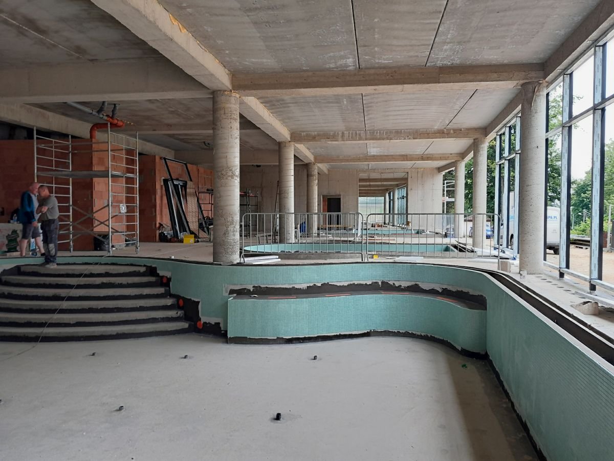 Wszystkie niecki są już wykładane mozaiką szklaną a w podbaseniu trwa montaż technologii basenowej.