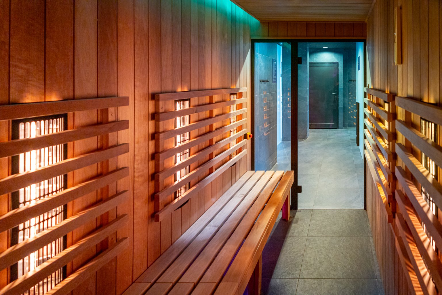 Wykonaliśmy strefę SPA na terenie hotelu Termy Karkonosze w Staniszowie a w niej saunę InfraRED. Kabina sauny oraz siedziska zostały wykonane z drewna osika termo. Ściana przednia w formie przeszkalania a ściana końcowa z podświetlonych cegieł solnych. Dodatkowo zastosowaliśmy ukryte podświetlenie pod sufitem oraz pod ławkami.